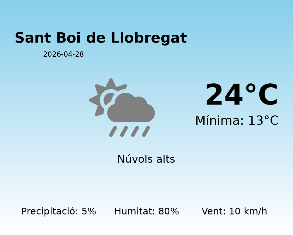 En resum, Sant Boi de Llobregat experimentarà un dia típicament primaveral amb una mescla de sol, núvols i possibles pluges lleugeres. Es recomana aprofitar les hores més clares per realitzar activitats a l’exterior, tot tenint