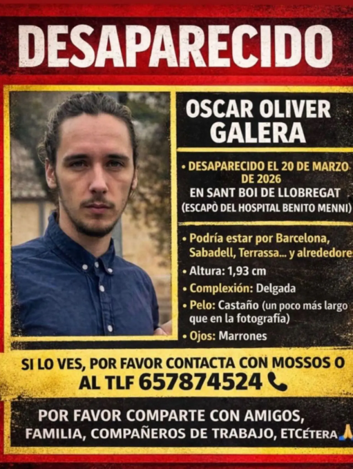 Sant Boi de Llobregat viu dies d’inquietud després de la desaparició d’un jove, Óscar Oliver Galera, de qui no se’n tenen notícies des del passat 20 de març. Els Mossos d’Esquadra han activat el dispositiu de recerca i demanen la col·laboració ciutadana per intentar localitzar-lo com més aviat millor.
