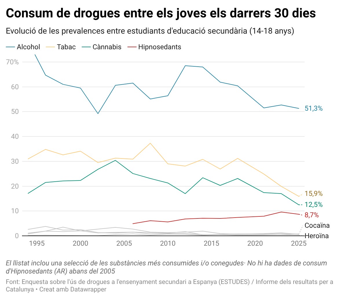 L’alcohol continua sent la substància psicoactiva més consumida entre els joves, tot i que les prevalences s’han estabilitzat. Els percentatges d’estudiants que s’han emborratxat o que han fet un consum intensiu d’alcohol en l’últim mes han assolit els valors més baixos des del 2000, si bé es mantenen alts: el 2006, el 47,1% dels adolescents havia fet un consum intensiu d’alcohol en l’últim mes i el 25% s’havia emborratxat, pel 21,5% i el 17,4%, respectivament, del 2025.