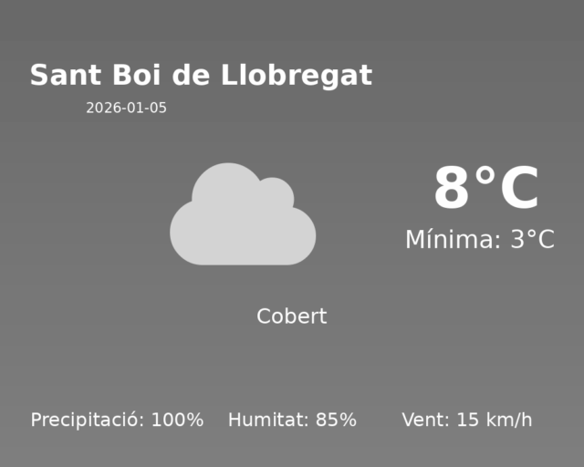 Bon dia! Avui, a Sant Boi de Llobregat, ens espera una jornada meteorològicament activa, caracteritzada per pluges intenses i temperatures baixes. És un dia per preparar-se per a possibles complicacions meteorològiques.