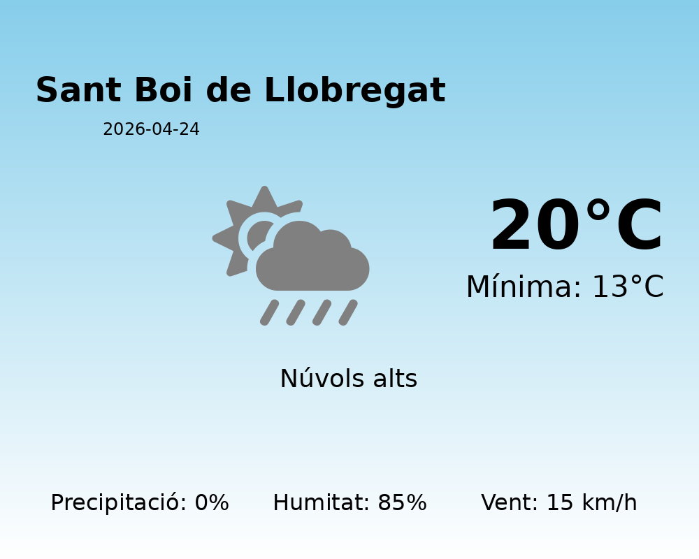 Avui, 24 d’abril de 2026, a Sant Boi de Llobregat, ens espera una jornada amb unes condicions meteorològiques força estables i agradables. El temps serà majoritàriament assolellat, ideal per a activitats a l’aire lliure.