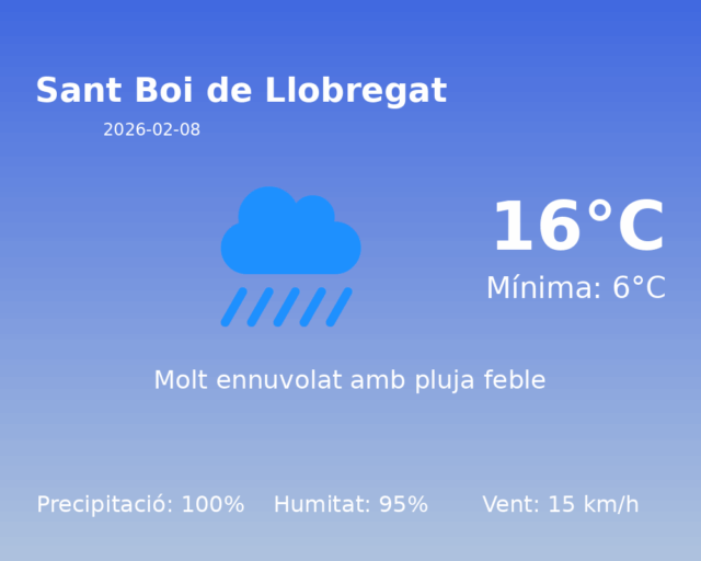 Avui, 8 de febrer de 2026, el temps a Sant Boi de Llobregat presenta unes condicions meteorològiques caracteritzades per un marcat ambient humit i ventós. A continuació, detallem la predicció del dia: