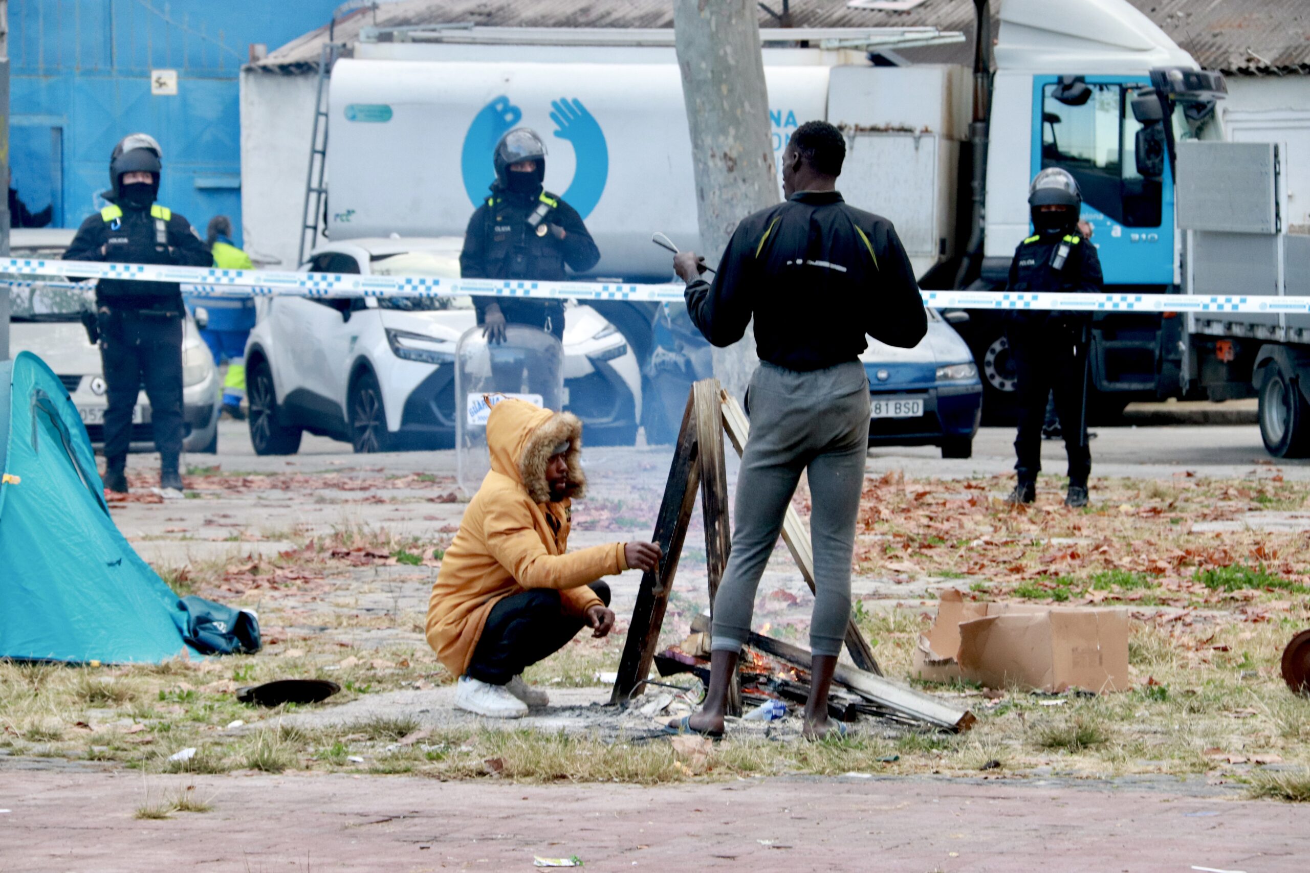 ACN Badalona – Els desallotjats del B9 que havien estat també foragitats de la plaça de davant l’edifici han tornat al punt on tenien muntada l’acampada, a l’espera de buscar un nou punt on instal·lar-se. Aquest divendres a primera hora la Guàrdia Urbana ha desplegat un fort operatiu per demanar als acampats que marxessin argumentant que els operaris de la brigada de neteja havien d’entrar a la plaça. Després de tres hores de negociacions, la cinquantena de migrants instal·lats al lloc han desmuntat les tendes i s’han situat a un carrer adjacent. Un cop completat l’operatiu de neteja, han tornat al lloc de l’acampada inicial, on han passat les dues últimes nits. La policia els manté encapsulats i els prohibeix posar les tendes.