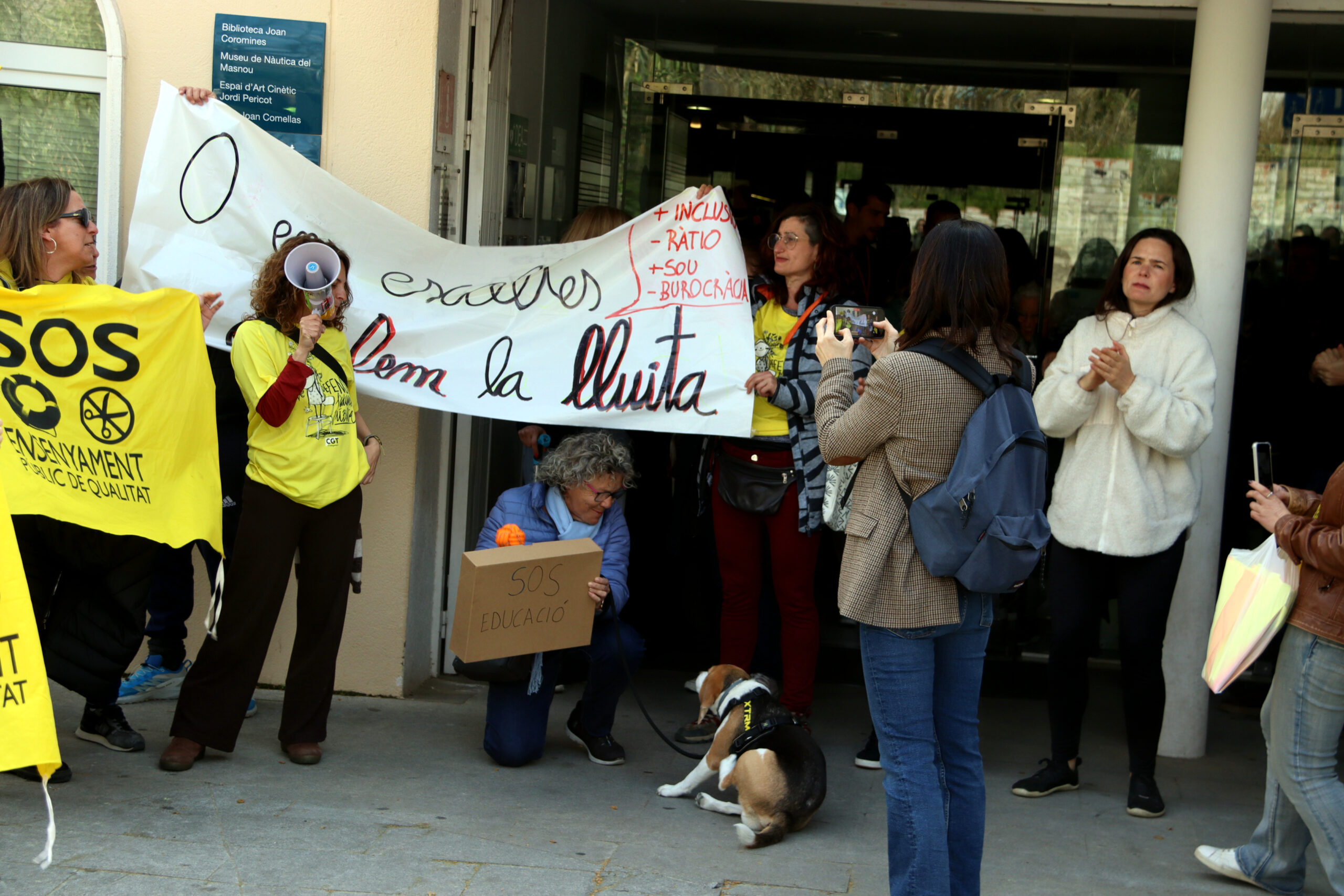 Tot i això, una manifestació convocada pels sindicats educatius a la plaça Nova de les Dones del Tèxtil del Masnou ha obligat a canviar de plans. L’acte s’ha acabat celebrant a porta tancada a la biblioteca del municipi mentre a les portes, els membres de la comunitat educativa es manifestaven, juntament amb partidaris de polítiques d’habitatge públic i gratuït.