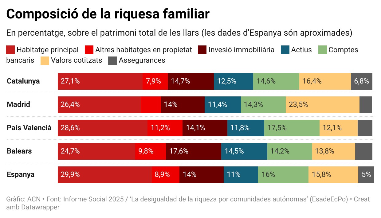 Tot i això, Catalunya no és la comunitat amb més pes dels actius immobiliaris -ni de primeres i segones residències, ni de les compres per inversió- en la riquesa de les llars. La seva estructura patrimonial és més “diversificada” que la de la majoria de comunitats autònomes i, de fet, és la tercera amb més pes dels actius financers, com fons d’inversió i accions (el 16,4% de tota la riquesa patrimonial del conjunt de les llars).