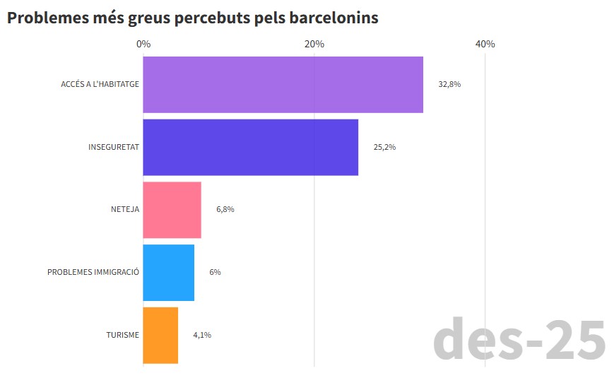ACN Barcelona – L’accés a l’habitatge continua com a principal problema dels barcelonins, amb un 32,8% de les respostes en el darrer baròmetre municipal, que ha publicat l’Ajuntament de Barcelona aquest dimarts. La xifra suposa un increment de gairebé tres punts respecte del mes de juny (29,9%) i assoleix el màxim de la sèrie històrica. La inseguretat es manté en segona posició (25,2%) i ressalta que gairebé un 90% de la ciutadania està a favor de l’enduriment de les sancions per incivisme. Entre els principals problemes també hi ha, a més distància, la neteja (6,8%) i qüestions associades a la immigració, que assoleixen el quart lloc (6%). En canvi, el turisme baixa 5,7 punts en mig any i es queda en el 4,1%.
