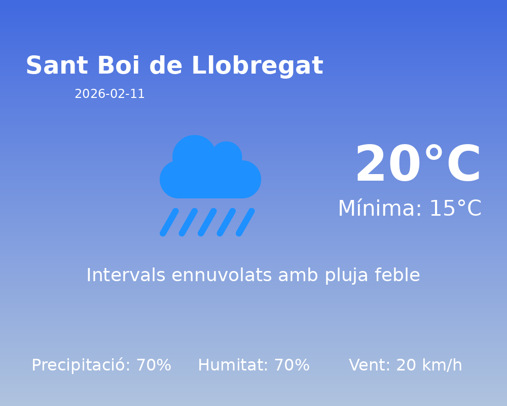 La jornada d’avui es presenta amb condicions variables a Sant Boi de Llobregat. La temperatura màxima arribarà als 20 °C, mentre que la mínima es situarà al voltant dels 15 °C, oferint un ambient relativament suau per a aquesta època de l’any.