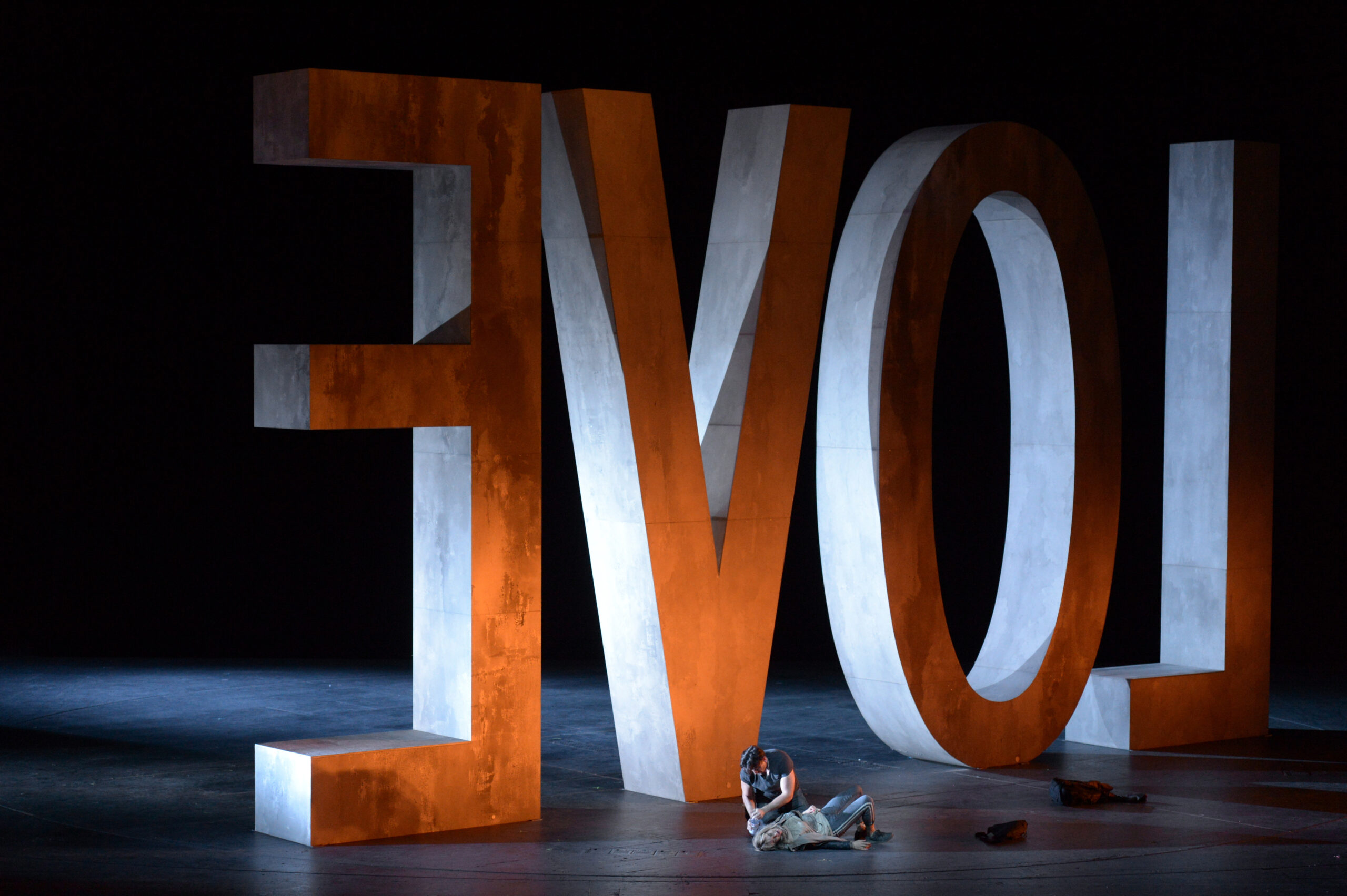 Amb el vestuari urbà de Lluc Castells i l’escenografia d’Alfons Flores, Ollé trasllada aquests personatges a espais reconeixibles. Els quatre actes transcorren en espais sòrdids i opressius. El primer se situa en una estació d’autobusos on s’insinua que Manon pot ser víctima d’una xarxa de tràfic de dones, amb un Geronte disposat a pagar per ella. El segon converteix la casa de Geronte en un entorn de degradació i abús. El tercer presenta una presó asfixiant, propera a un centre de deshumanització. Finalment, el quart acte, ambientat al desert de Louisiana, l’escenari queda gairebé buit, amb l’única presència de l’estructura que, al llarg de tota l’obra, ha format les quatre lletres de ‘LOVE’.